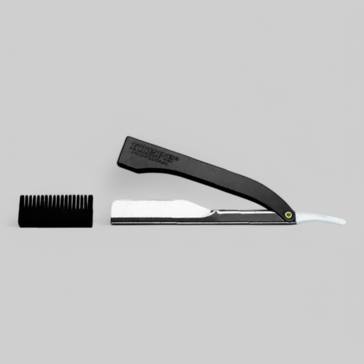 Профессиональная складная парикмахерская опасная бритва от известного бренда Kiepe. Выполнена в черном цвете из материалов высокого качества. Имеет металлическую ручку с упором для пальцев, совместима с любыми классическими лезвиями, насадка-расческа в комплекте. Безопасна и удобна в использовании, надежна и долговечна.