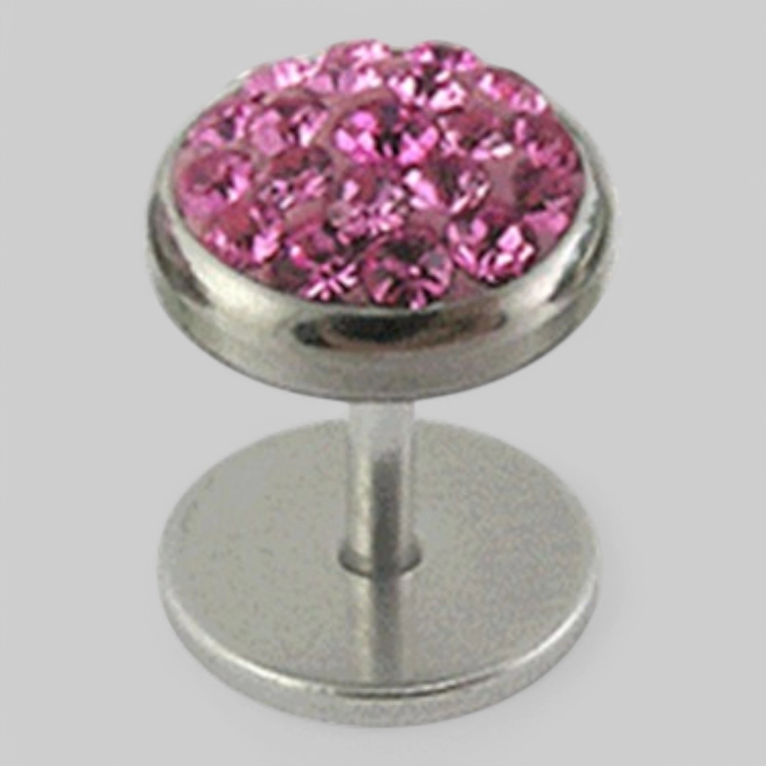 Серьга тунельная "обманка" диск усыпанный стразами. Цвет - розовый.