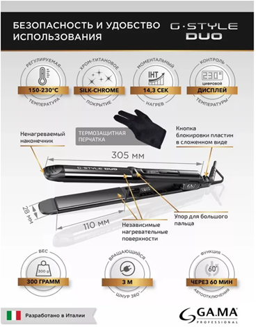 GA.MA G-STYLE DUO IHT DIG OXY.ACTIVE - G-STYLE DUO OXY-ACTIVE это мощный профессиональный выпрямитель 2 в 1 с технологией IHT (моментальный нагрев), оснащенный 4-мя нагревательными поверхностями, 2-мя внешними и 2-мя внутренними, которые можно активировать независимо друг от друга. Это идеальный инструмент для выпрямления или завивки волос с максимальной легкостью и эффективностью благодаря округлой форме. Благодаря регулировке температуры от 150 до 230 °C (с шагом 10 °C) его можно использовать для любого типа волос. Выпрямитель оснащен технологией Oxy-Active: действие активного кислорода и ионов сохраняет естественную влажность волос, придает им блеск и поддерживает цвет окрашенных волос (эффект запечатывания цвета волос), а также позволяет глубоко очистить кожу головы. Внешняя поверхность волос регенерируется, устраняется пушистость и наэлектризованность. Плавающие пластины 28 x 110 мм с хром-титановым покрытием Silk-Chrome Titanium защищают волосы от перегрева и способствуют плавному и безупречному скольжению. Для удобства использования есть кнопка блокировки пластин в сложенном состоянии и цифровой дисплей для контроля температуры. Ненагреваемый наконечник, нескользящая ручка, термозащитная перчатка, функция автоотключения через 60 минут бездействия и вращающийся на 360° 3 метровый шнур с петлей для подвешивания обеспечивают большую свободу движений и максимальную безопасность во время использования, что делает его идеальным рабочим инструментом как в салоне, так и дома. Автовольтаж (диапазон напряжения 110-240 В ~) позволяет использовать прибор даже за границей. Вес прибора всего 300 грамм.