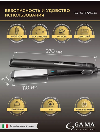 GA.MA G-STYLE WIDE DIGITAL IHT OXY.ACTIVE - G-STYLE WIDE DIGITAL IHT OXY.ACTIVE это профессиональный выпрямитель с увеличенными плавающими пластинами 33 х 110 мм с хром-титановым покрытием Silk-Chrome Titanium, обеспечивающим превосходное скольжение даже по химически обработанным волосам. Благодаря технологий IHT прибор нагревается до максимальной температуры 230 °C всего за 14,3 секунды, что позволяет существенно сэкономить время на укладку и минимизировать тепловой стресс, так как температура остается постоянной. Технологии Oxy-Active и Ion Plus под действием активного кислорода и отрицательных ионов помогают в борьбе с наэлектризованностью, дарят превосходный блеск волосам. Для удобства использования есть цифровой дисплей для контроля температуры, функция автоотключения через 60 минут бездействия и вращающийся на 360° 3 метровый шнур с петлей для подвешивания Благодаря регулировке температуры от 150 до 230 °C (с шагом 10 ° C ) его можно использовать для любого типа волос. Вес прибора всего 260 грамм.